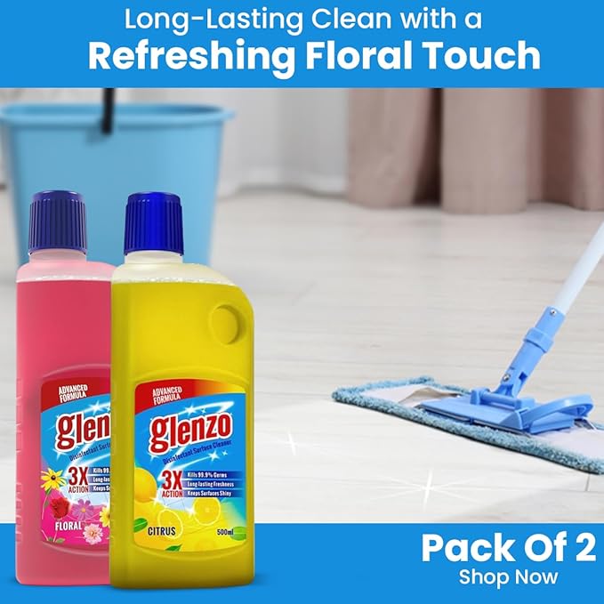 - Dual Fragrance Pack: Includes two 500 ml bottles of Glenzo Floor Cleaner in Citrus and Floral scents, providing a refreshing variety for your cleaning needs.